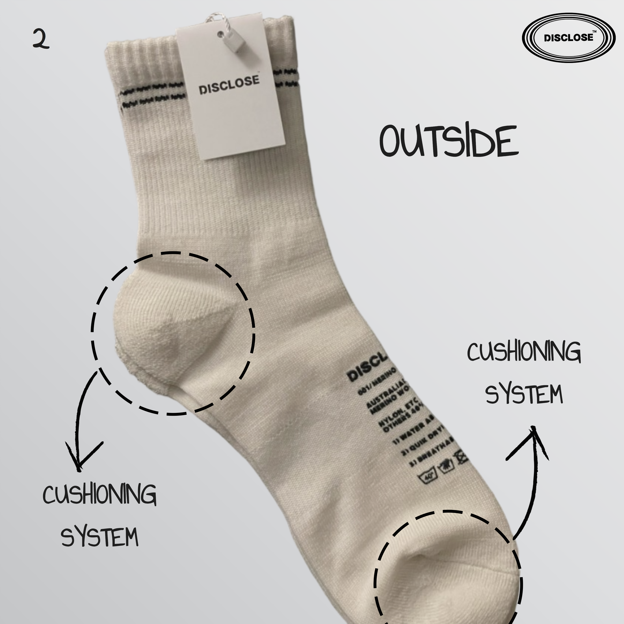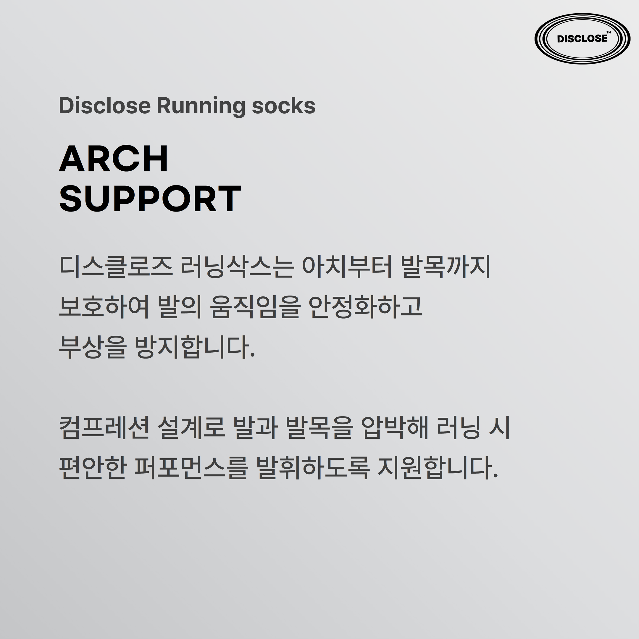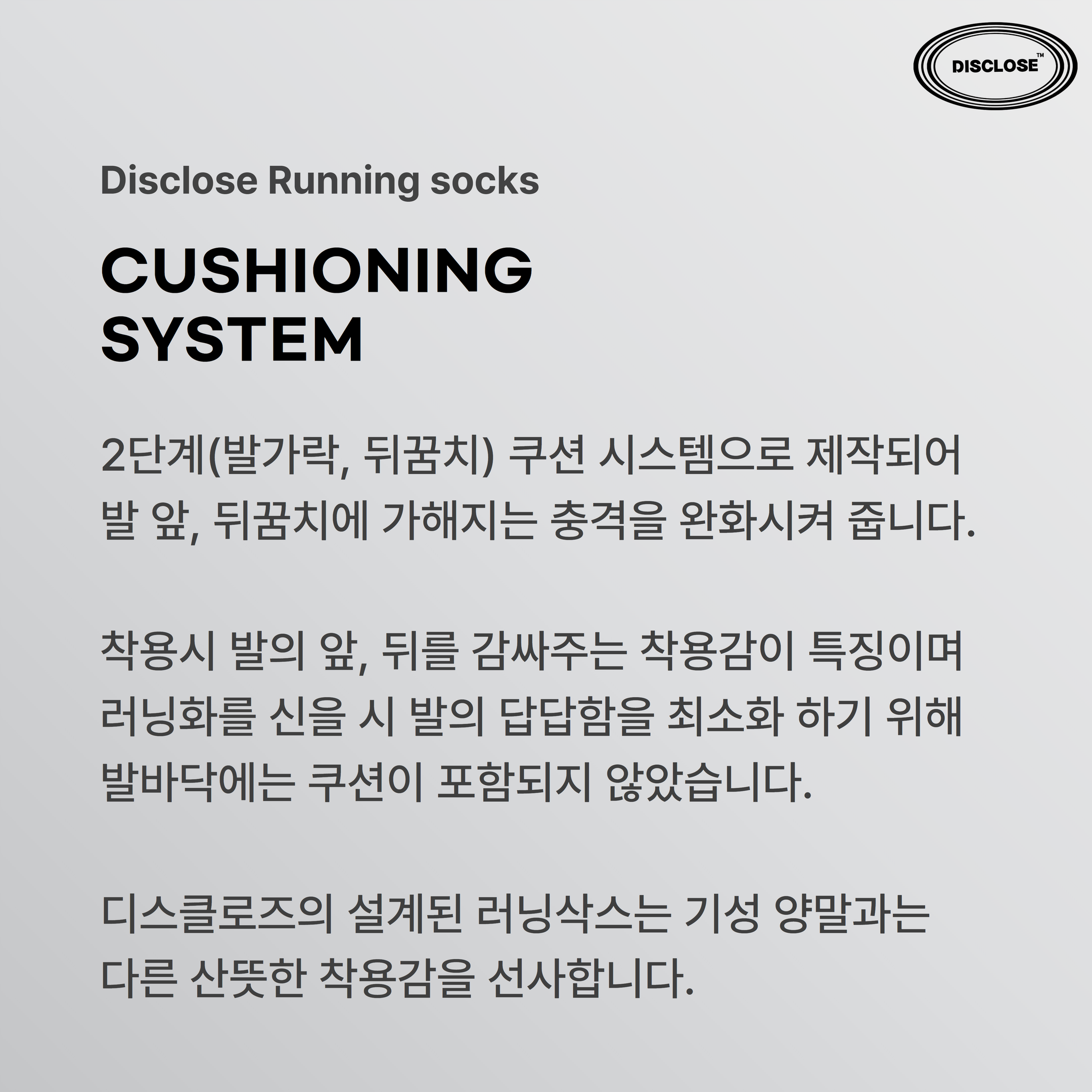 - Running socks는 2단계(발가락, 뒤꿈치) 쿠션 시스템으로 제작하였습니다.